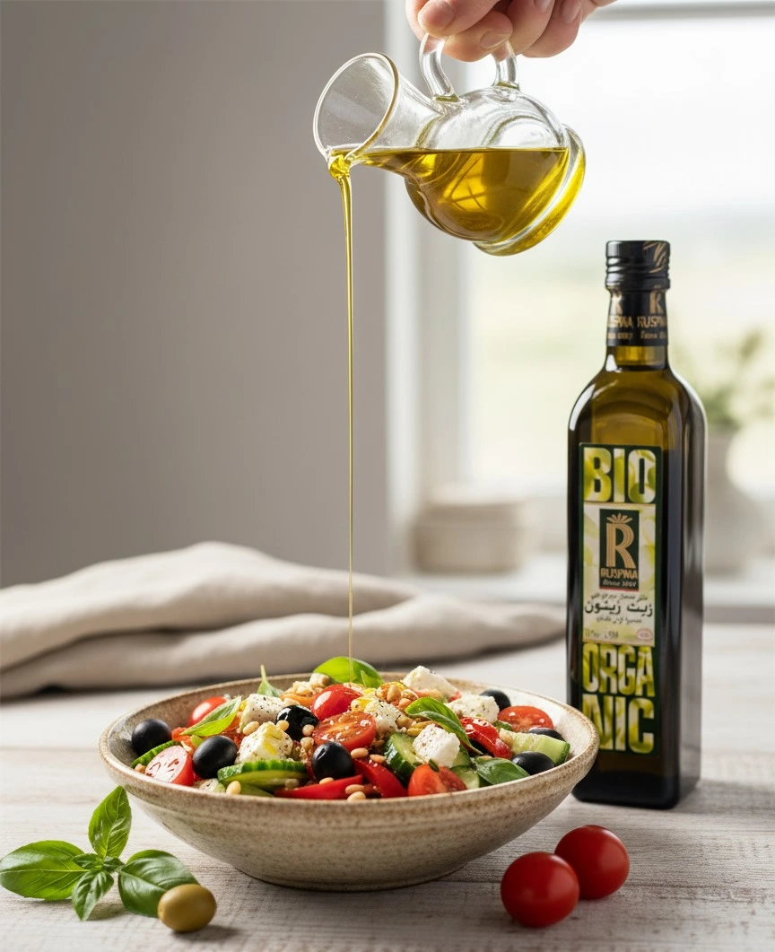 Découvrez une recette fraîche, saine et pleine de saveurs qui célèbre l’excellence de l’huile d’olive tunisienne Ruspina. Depuis 1887, Ruspina est synonyme de tradition et de qualité, offrant une huile d’olive pure, naturelle et délicatement parfumée. Cette salade méditerranéenne simple mais raffinée est parfaite pour un déjeuner léger ou un apéritif convivial, où chaque ingrédient est sublimé par l’arôme unique de Ruspina.